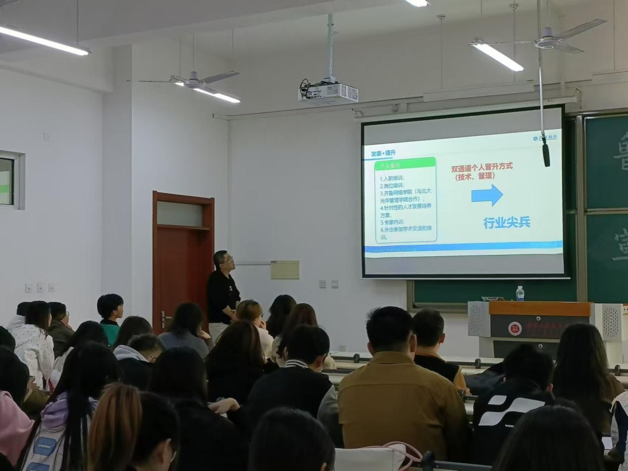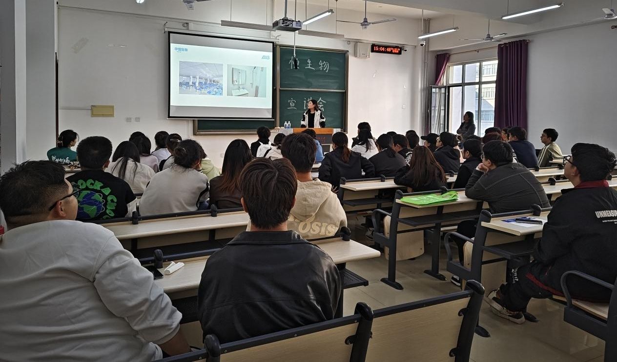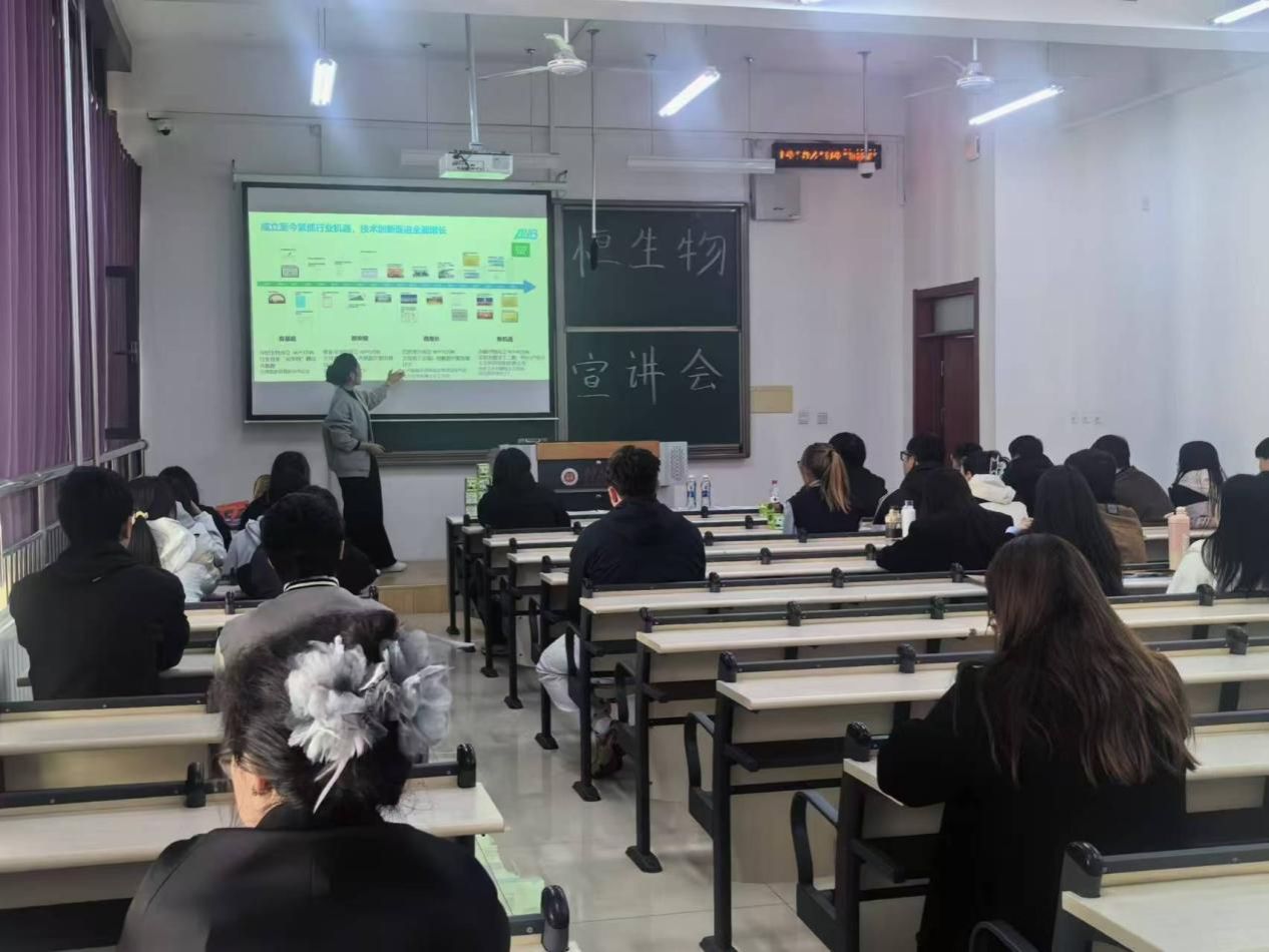 神舟生物科技有限责任公司人力资源部部长刘娜从企业情况介绍、招聘岗位介绍、薪资福利待遇、晋升通道、人才留用等多个方面进行宣讲和介绍,并现场为同学们答疑。