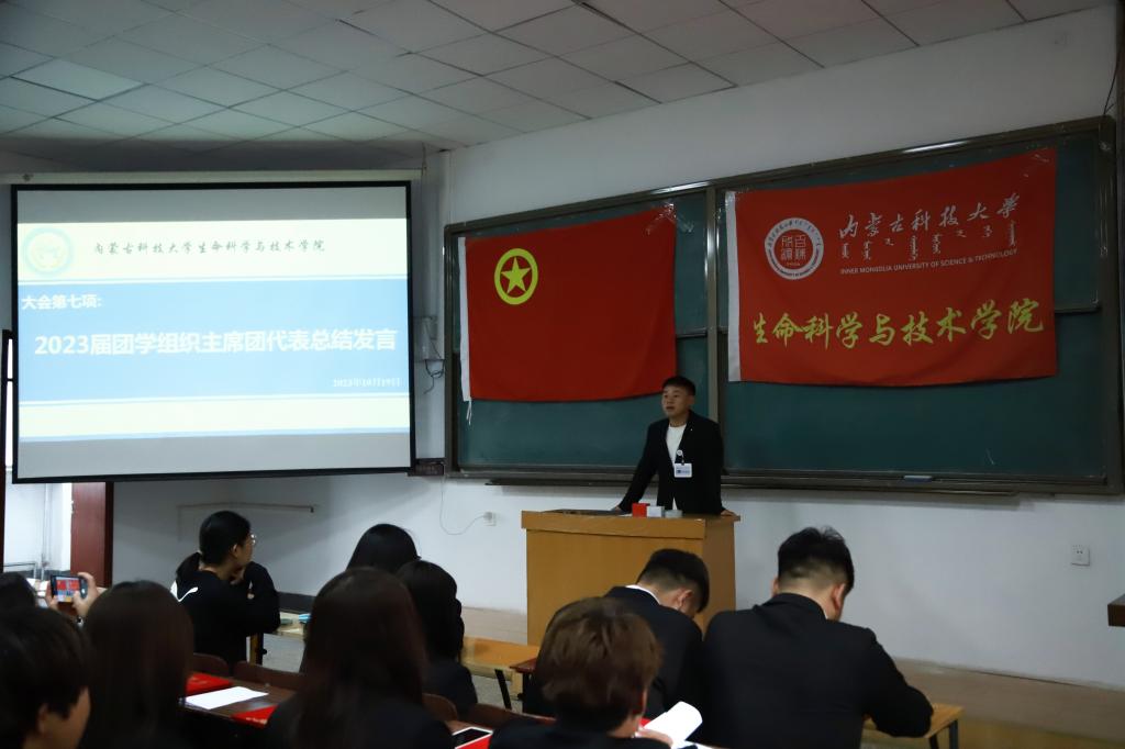 大会第七项:2023届团学组织主席团代表总结发言。主席团主席许双丁同学代表304永利2023届团学组织全体成员进行了总结发言。